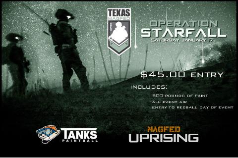 Operation:Starfall Jan 10, 2015 Tanks Paintball Registration Attendees: Dan "Mayhem" Tecson Dave "Tex" Tecson Emile "Snax" Payne NJ "King Klotz" Patel Eli "Apollo" Lledo Del Ray "Venom" Cross