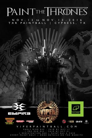 Paint the Thrones Nov 12, 2016 to Nov 13, 2016 TXR Paintball Registration Awards: Victorious Commander ("Kratos") Attendees: Dan "Mayhem" Tecson Dave "Tex" Tecson Roland "VooDoo" Rosales Leo "Ghost" Pineda David "Flaco" Cruz Ashley "Raven" Villarreal Santiago "Pyro" Cortez Chris "Havoc" Villarreal Isaac "Taps" Gonzales Dino "Littlefoot" Cortez Marcus "10k" Lovito Emile "Snax" Payne Dillon "Rabbit" Tecson Sal "Cerberus" Alcaraz Scott "Jango" Jarquin Ken "Doc" Benedict Cooper "Stitch" Benedict NJ "King Klotz" Patel Jason "Hypnos" Tesch Matthew "Saloon" Bilke Anthonella "CHOMP CHOMP" Scovino Matt "Chaos" McCain Blake "Badfish" Simon Del Ray "Venom" Cross Rene "Hina" Ortiz Eli "Apollo" Lledo Laurie "Maz" Jarquin Brehonna "HarleyQ" Moore Kristie "Shadowcat" Wendt