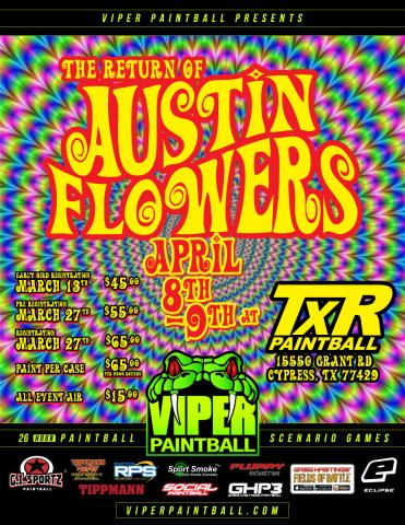 The Return of Austin Flowers Apr 8, 2017 to Apr 9, 2017 TXR Paintball Registration Attendees: Dan "Mayhem" Tecson Dave "Tex" Tecson Roland "VooDoo" Rosales David "Buddha" Gonzales Isaac "Taps" Gonzales Dino "Littlefoot" Cortez Leo "Ghost" Pineda Ashley "Raven" Villarreal David "Flaco" Cruz Emile "Snax" Payne Santiago "Pyro" Cortez Dillon "Rabbit" Tecson Scott "Jango" Jarquin Ken "Doc" Benedict Cooper "Stitch" Benedict NJ "King Klotz" Patel Laurie "Maz" Jarquin Matthew "Saloon" Bilke Eli "Apollo" Lledo Anthonella "CHOMP CHOMP" Scovino Blake "Badfish" Simon Kristie "Shadowcat" Wendt